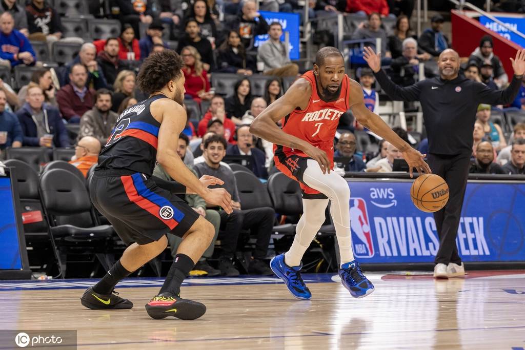 首节开打,比赛就呈现出一种老派的气象,双方都花了大量时间在防守端做文章。结果,杜兰特在严控之下,只在节初和节末各自命中一个运动战进球。幸好,火箭自己的防守也相当在线,单节队员们通力配合只让活塞队得到了20分。